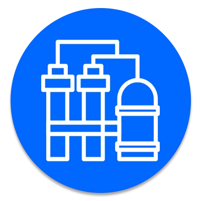 • الفلاتر الأولية (Pre-Filters): (الأسطوانات الزرقاء الكبيرة) تعمل على إزالة الشوائب، الرمال، والكلور لحماية الأغشية الرقيقة.