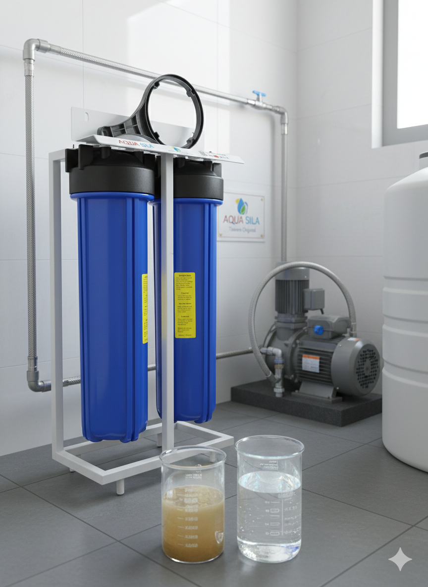 إليك وصفاً تفصيلياً لفلتر الجامبو 20 بوصة (مرحلتين) الذي يعتبر الحل الأمثل للمنازل الكبيرة والفلل والشاليهات، حيث يعمل كخط دفاع أول للمياه الداخلة للمبنى: